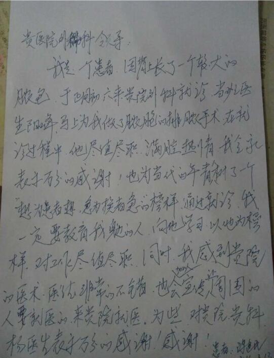 2、外科郭梦溪医生,主管36床病友刘志成,直肠癌造瘘术后并发肠瘘,每日忍受恶臭,艰难换药2—3小时,坚持近2个月。在科主任的指导下,工作细心周到,毫无怨言。尽管病人终究不治而去,家属也花费了较多的医疗费用,但对科室尽心细致周到服务非常满意,老人后事完成后,及时返院结账,并对郭梦溪主管医生和科室全体表达了衷心的谢意。